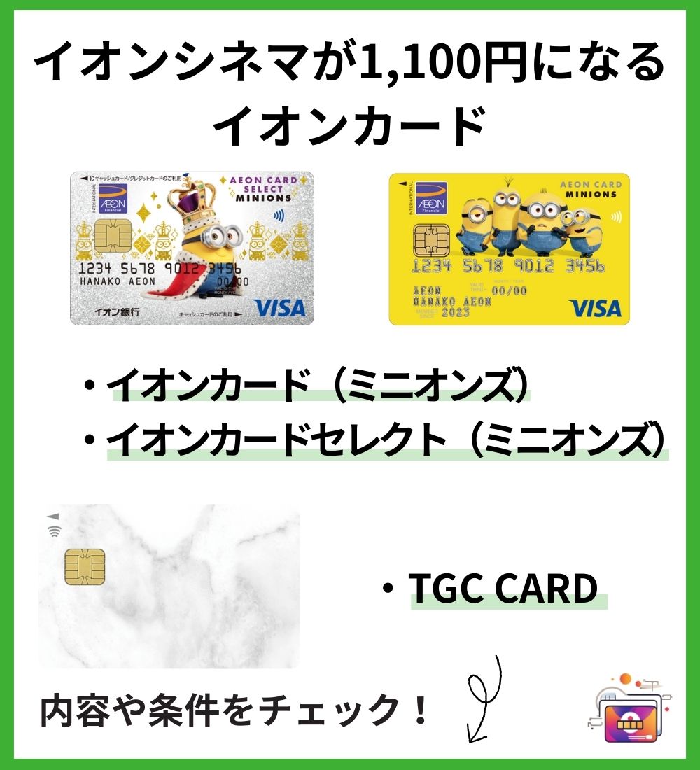 イオンシネマを1回1,000円で見られるのは、「イオンカード(ミニオンズ)」「イオンカードセレクト(ミニオンズ)」「TGC CARD」の3種類です。